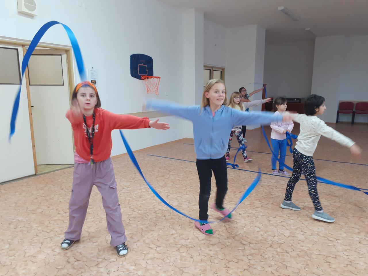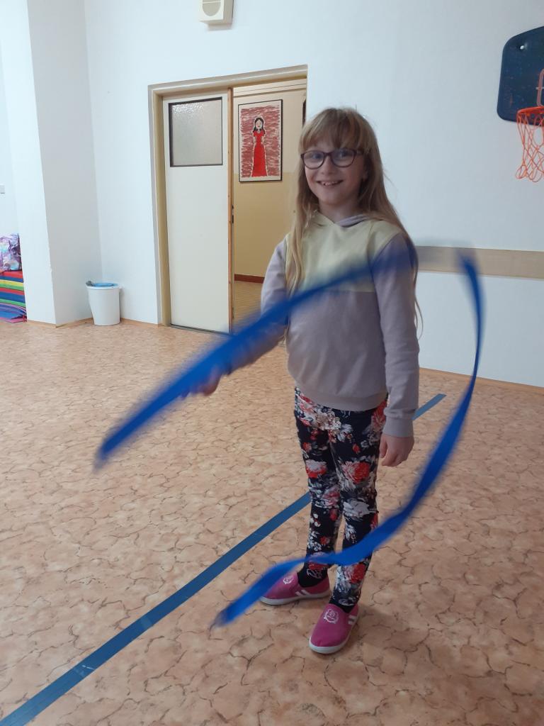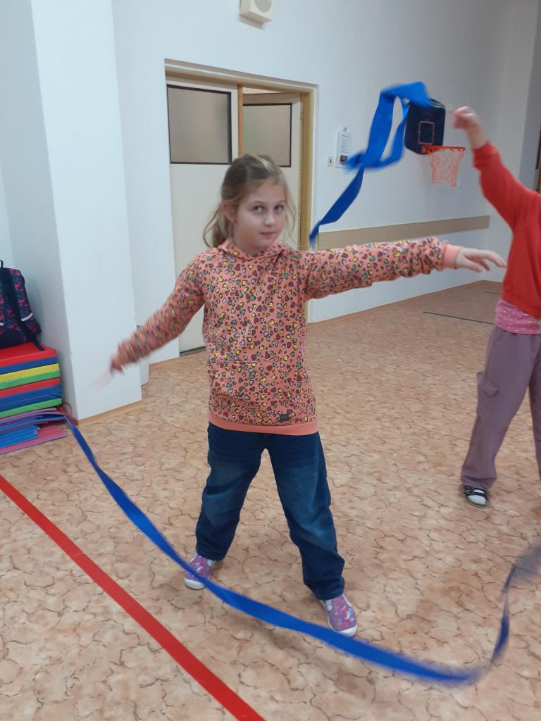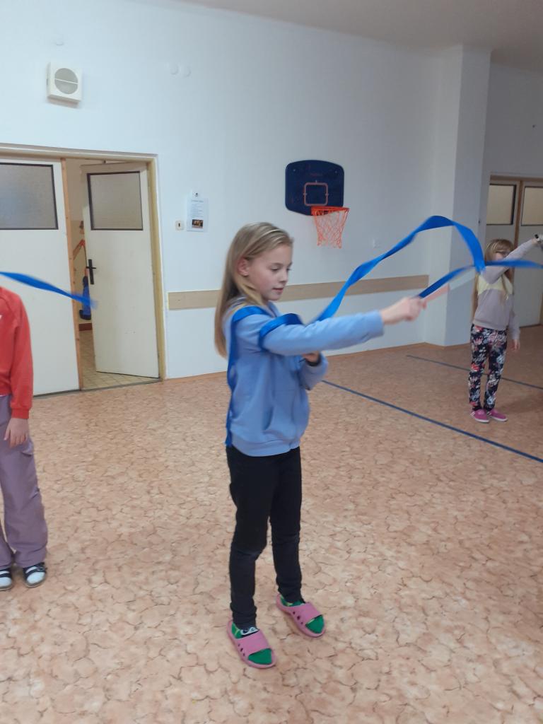 Pod vedením paní vychovatelky Evy Buchové nacvičuje dramatický kroužek vystoupení se stuhou.