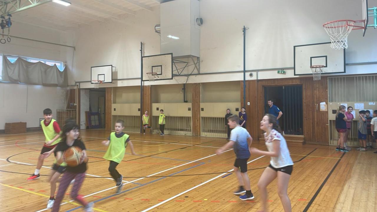 Třicet kluků a holek od třetí do páté třídy bylo rozlosováno do šesti poměrně vyrovnaných týmů. S rozhodcováním nám pomáhal náš nejzkušenější basketbalista z deváté třídy - Jára Dostál, který se věnuje košíkové již dlouhou dobu a který je pro naše malé sportovce velkým sportovním vzorem.