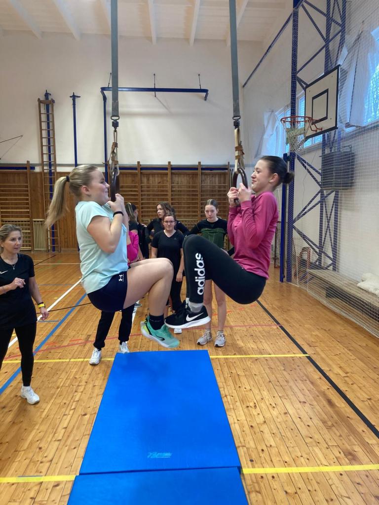 První hodiny se účastnila děvčata devátých ročníků, s kterými lektoři prováděli cvičení pro rozvoj základní kloubní mobility a gymnastickou průpravu. Všechna cvičení probíhala hravou formou s množstvím zajímavých pomůcek a se zaměřením na pohybovou disciplínu.