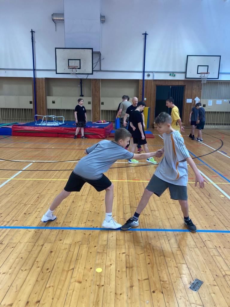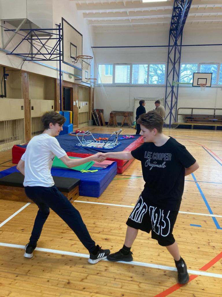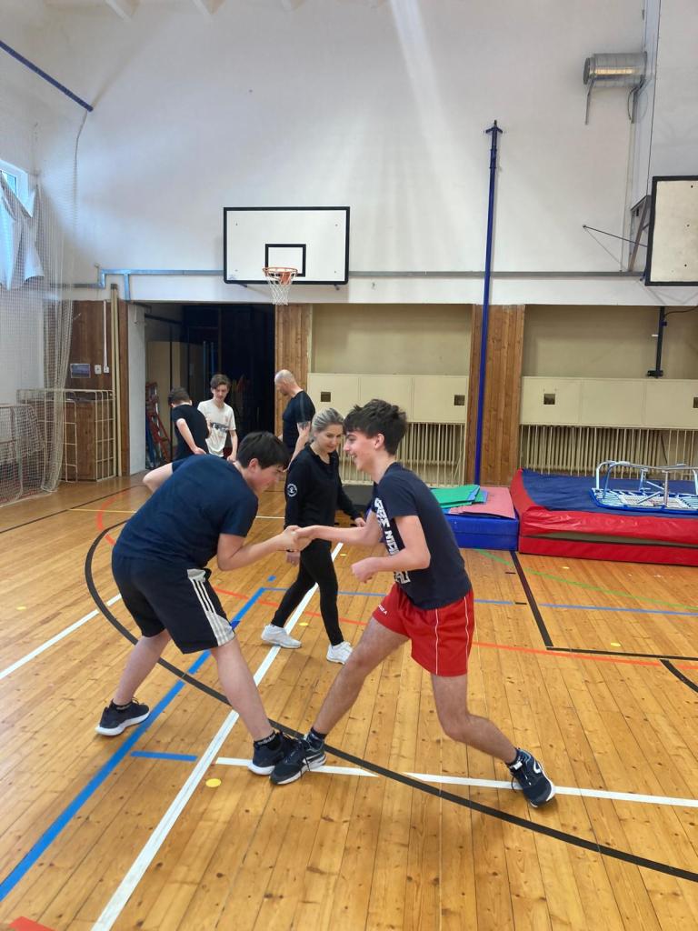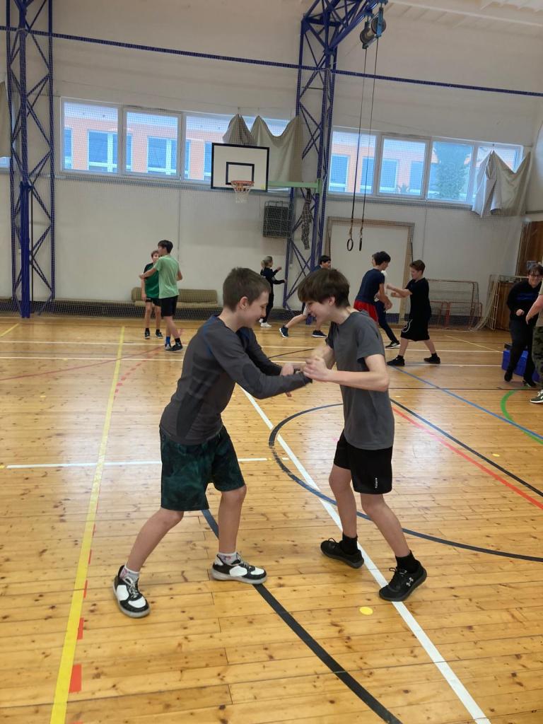 Závěrečná lekce patřila klukům z osmých tříd. Rozvoj pohybu zaměřený na úpolové sporty chlapce velmi bavil. V kontaktních úpolových hrách rozvíjeli svoji sílu a obratnost se svými spolužáky.
