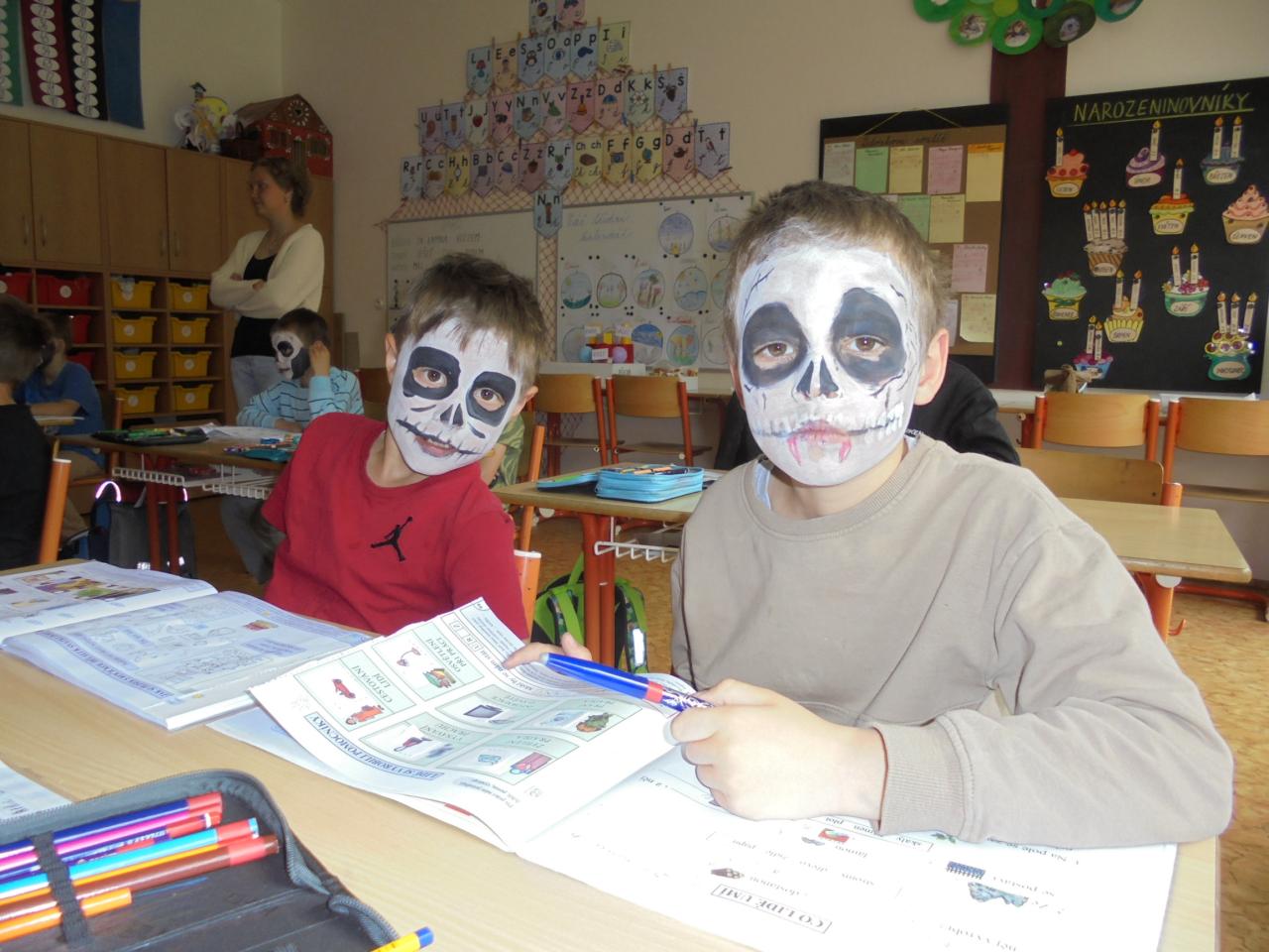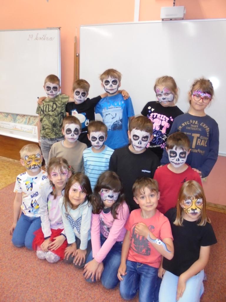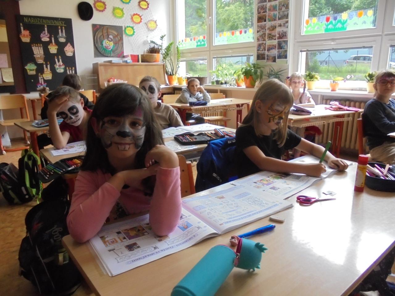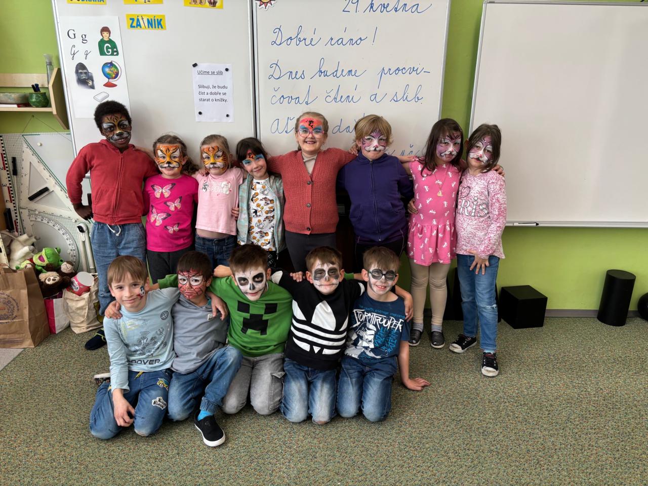 Na naše prvňáčky čekalo dnes ráno velké překvapení, o kterém věděli pouze rodiče a také paní Kateřina Kuchynová z Dobříva, která jim zdravotně nezávadnými barvami namalovala jiný obličej.