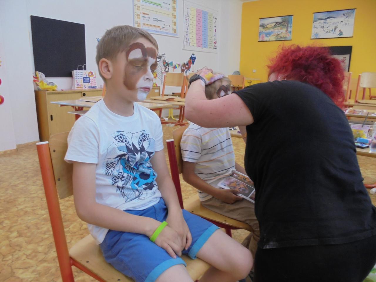 Dnes ráno čekalo prvňáčky velké překvapení v podobě malovaného obličeje zdravotně nezávadnými barvami. Děti si mohly vybrat z široké nabídky zvířecích či pohádkových motivů, které jim pak šikovná výtvarnice paní Kuchynková z Dobříva namalovala na obličej.