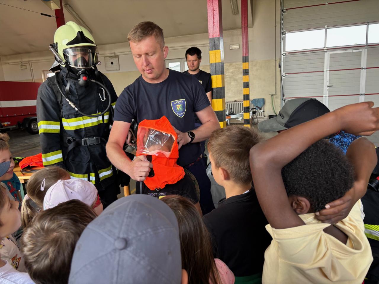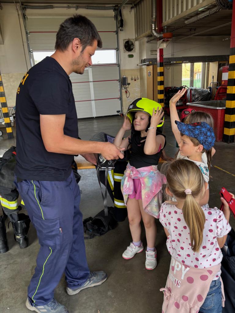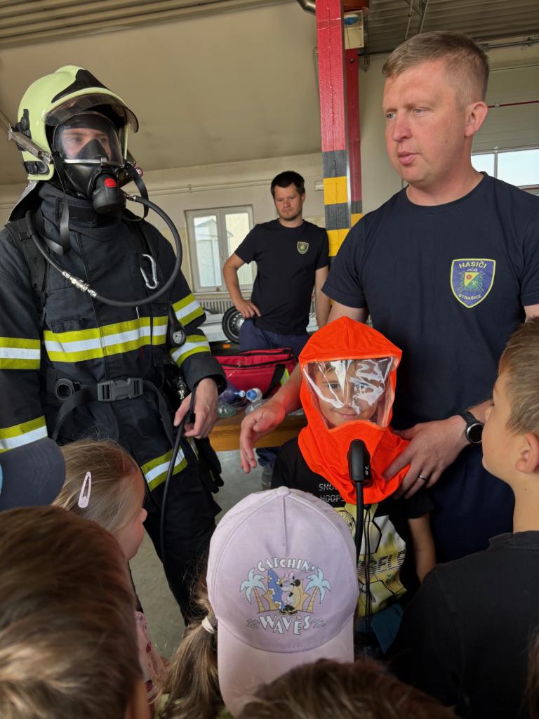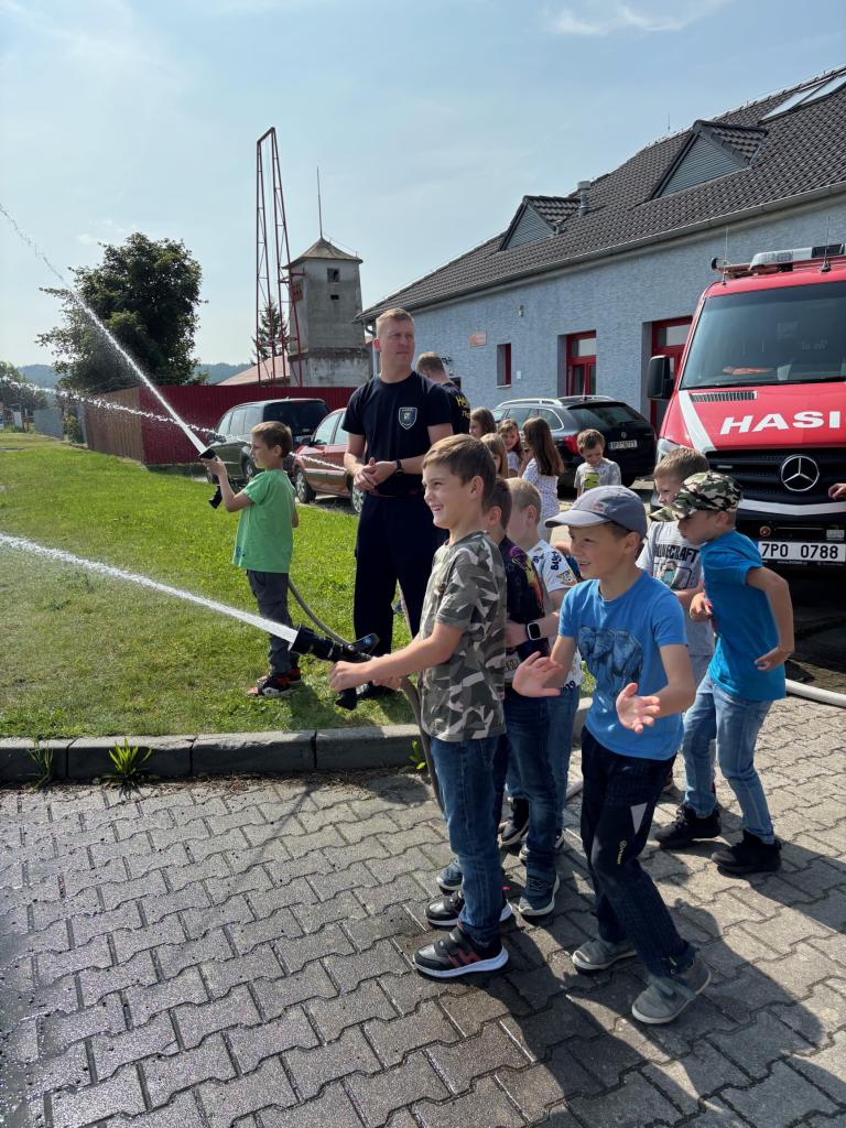 Za slunečného počasí navštívily postupně jednotlivé třídy 1. stupně místní hasičskou zbrojnici, kde si žáci prohlédli požární techniku včetně vybavení. Měli možnost vyzkoušet si hasičský oděv, potěžkat obuv, nasadit si helmu či dýchací přístroj. Děti se také seznámily s nářadím, které je pro většinu z nich cizí, a dozvěděly se o důležitosti práce hasičů v naší společnosti. Největším zážitkem pro všechny byla možnost stříkat z hasičské proudnice, což vyvolalo v dětech nadšení a radost.