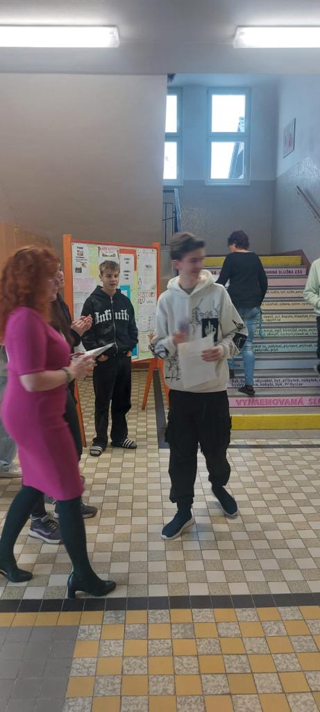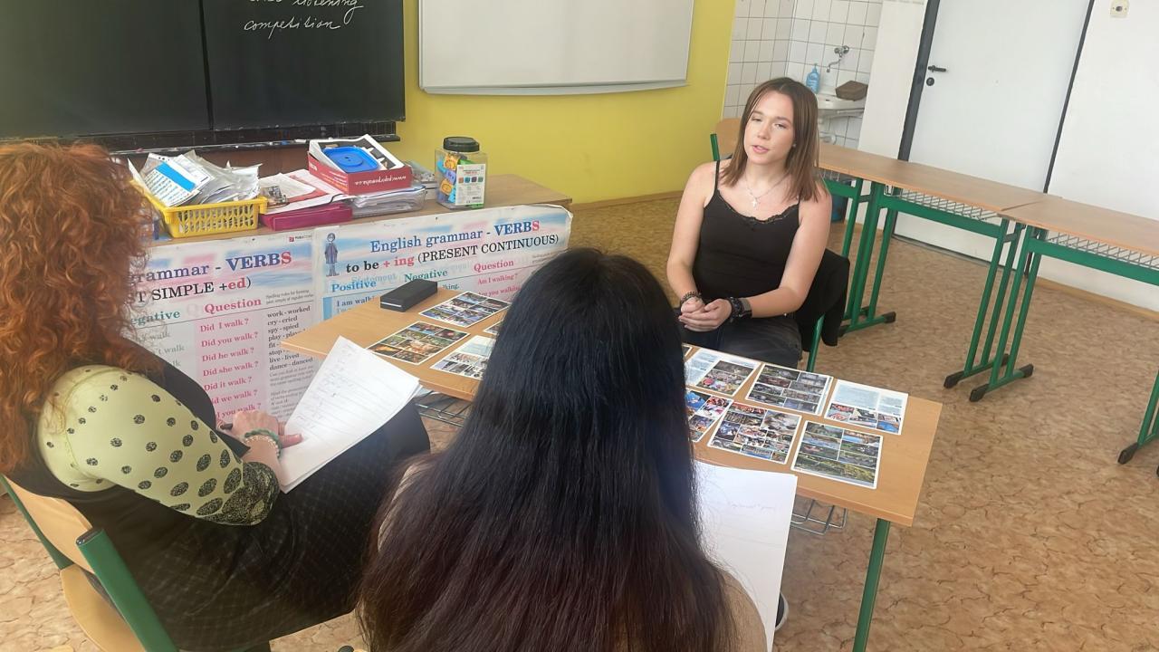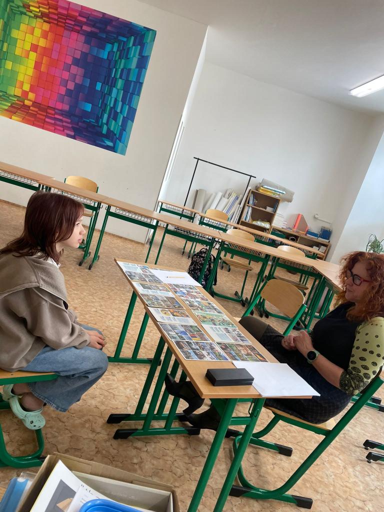 Potom už žáci přicházeli jednotlivě ke “komunikativnímu stolečku“, kde proběhlo úvodní rozmluvení o své osobě a následně konverzace v oblasti vybraného tématu, kterými byly například – bydlení, rodina, životní prostředí, venkov, nakupování, lékař, stravování a další okruhy z běžného života.