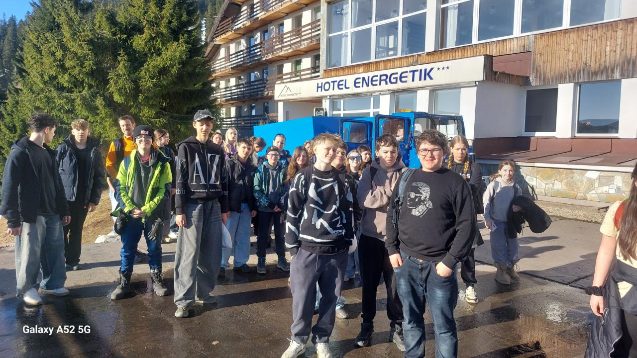Parta jednačtyřiceti kluků a holek se čtyřmi pedagogy se “nalodila“ na palubu autobusu v neděli před polednem a před pátou odpolední už zdolávala strmý svah k hotelu Enegetik, který leží uprostřed sjezdovky Hnědý vrch, takže je skvělým výchozím bodem pro všechny sjezdové lyžaře.