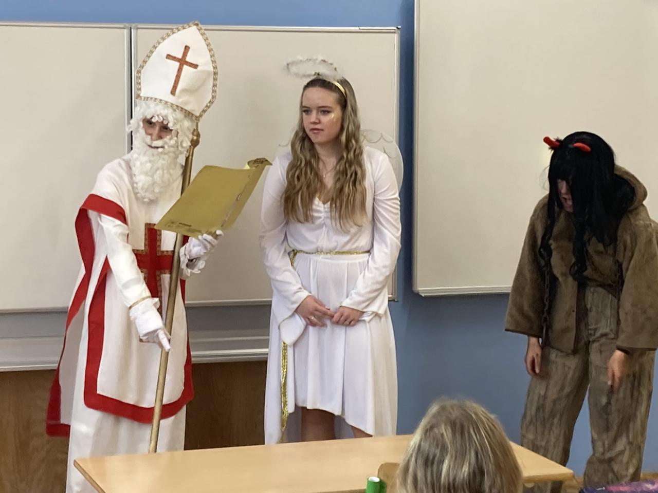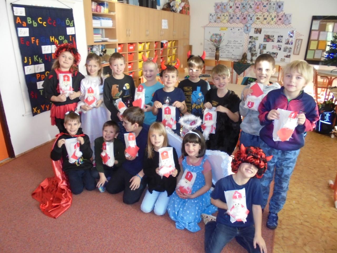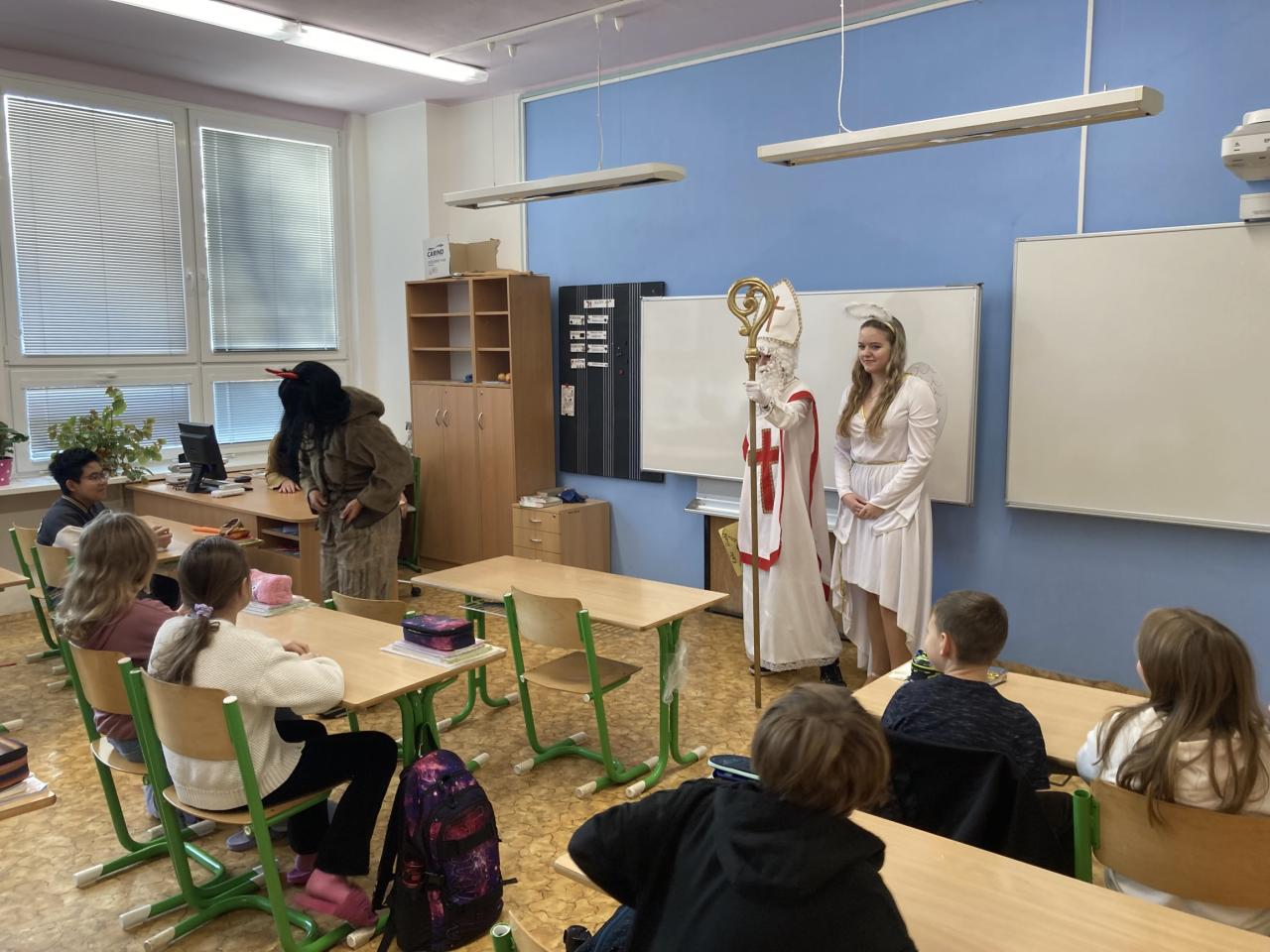 Role Mikuláše, čerta a anděla se zhostily: Karolína Chodorová, Vallery Šlechtová a Natálie Bílková, žákyně 9. ročníku. Navštívily všechny třídy na 1. stupni a rozdaly dětem drobnou nadílku.