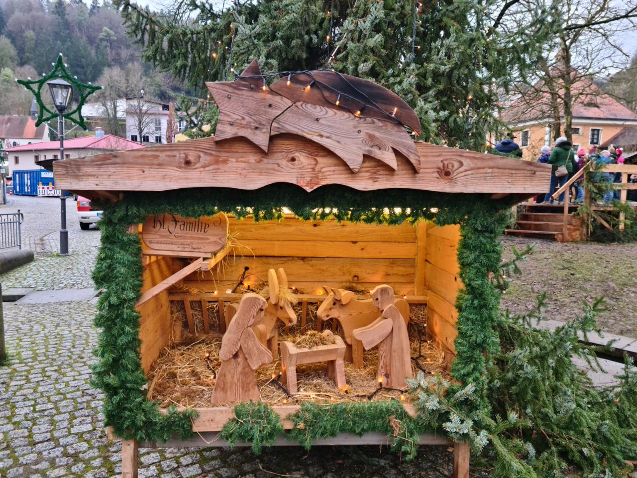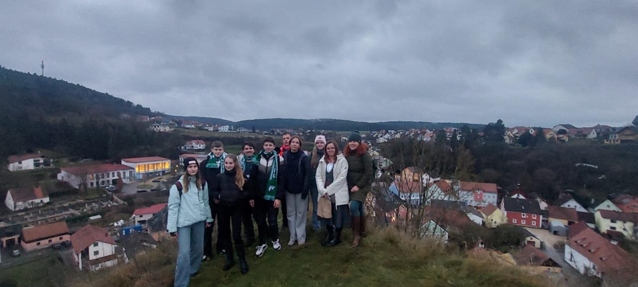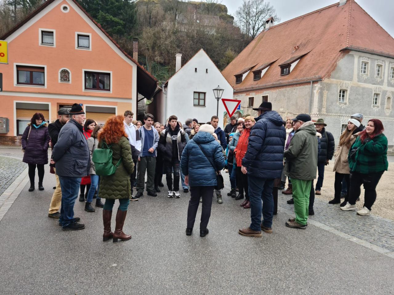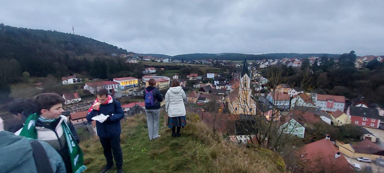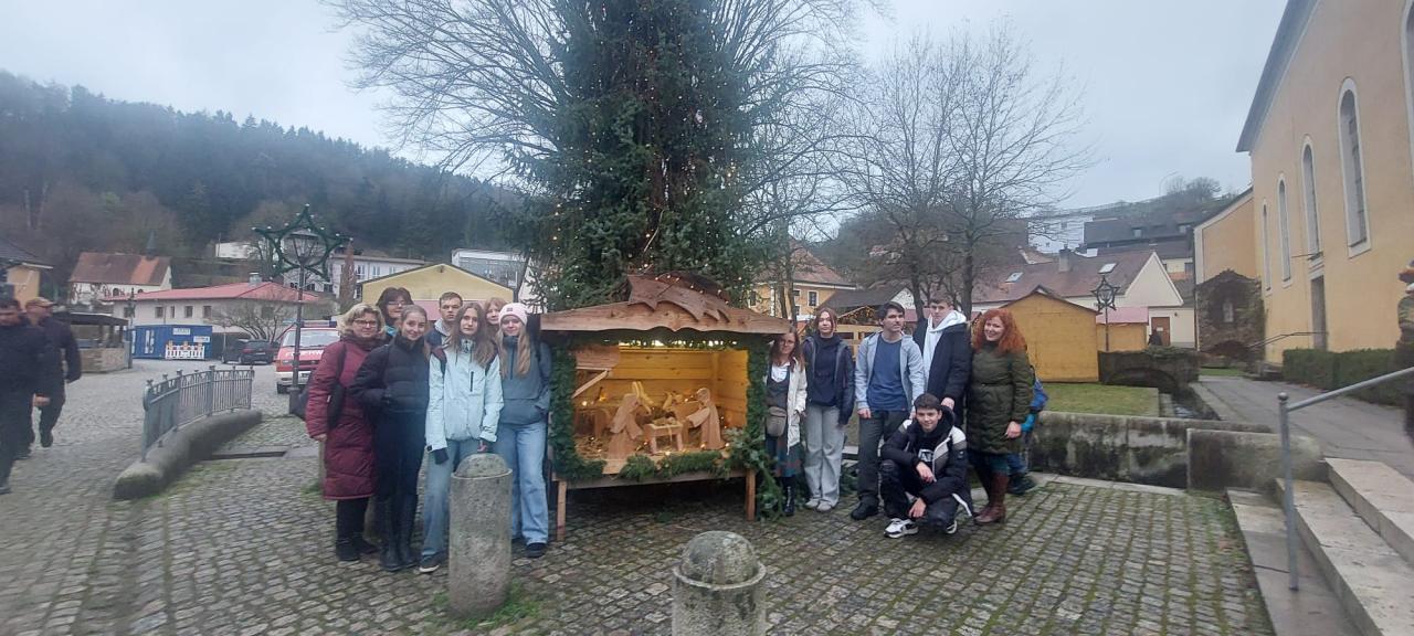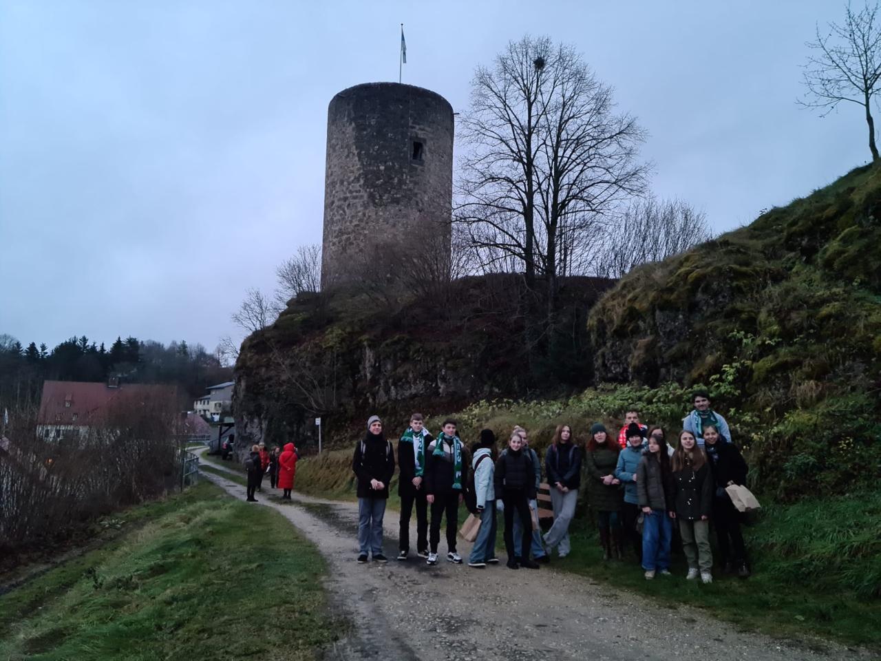 Po slavnostním přivítání a bohatém občerstvení se školní skupinka připojila k prohlídce společenské budovy, knihovny a mateřské školy. Když na hohenfelském kostele odbila třetí hodina odpolední, s německou přesností byl zahájen program vánočních trhů v centru obce, kam jsme se všichni přesunuli. Naši účastníci mohli sledovat slavnostní projevy a zpěvy, v prostorách fary mohli zhlédnout působivou výstavu betlémů a kochat se procházkou mezi slavnostně nazdobenými vánočními stánky s rozličným sortimentem. Okolo čtvrté hodiny odpolední jsme společně vyšlápli na kopec tyčící se nad městečkem ke zřícenině hradu, kde je nádherný výhled na celý Hohenfels. Zpáteční dobrodružná cesta do centra městečka vedla podzemní štolou, kde jsme si svítili baterkami.