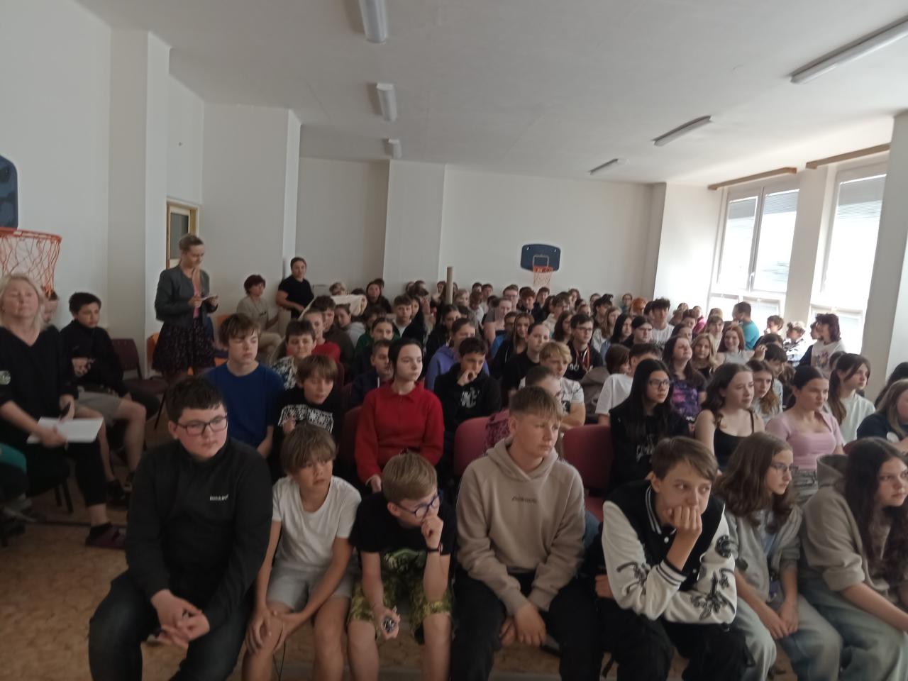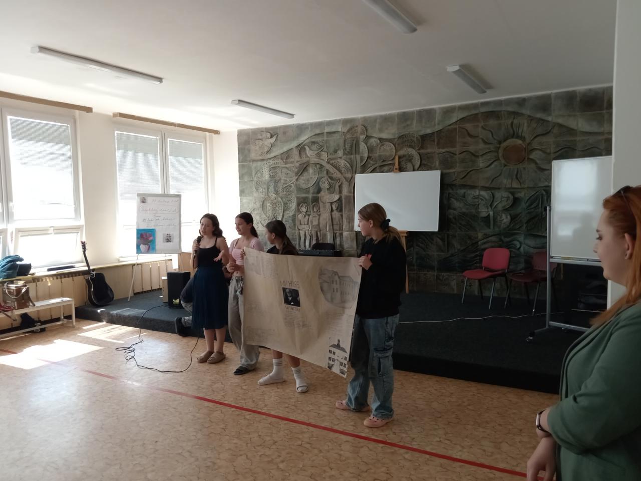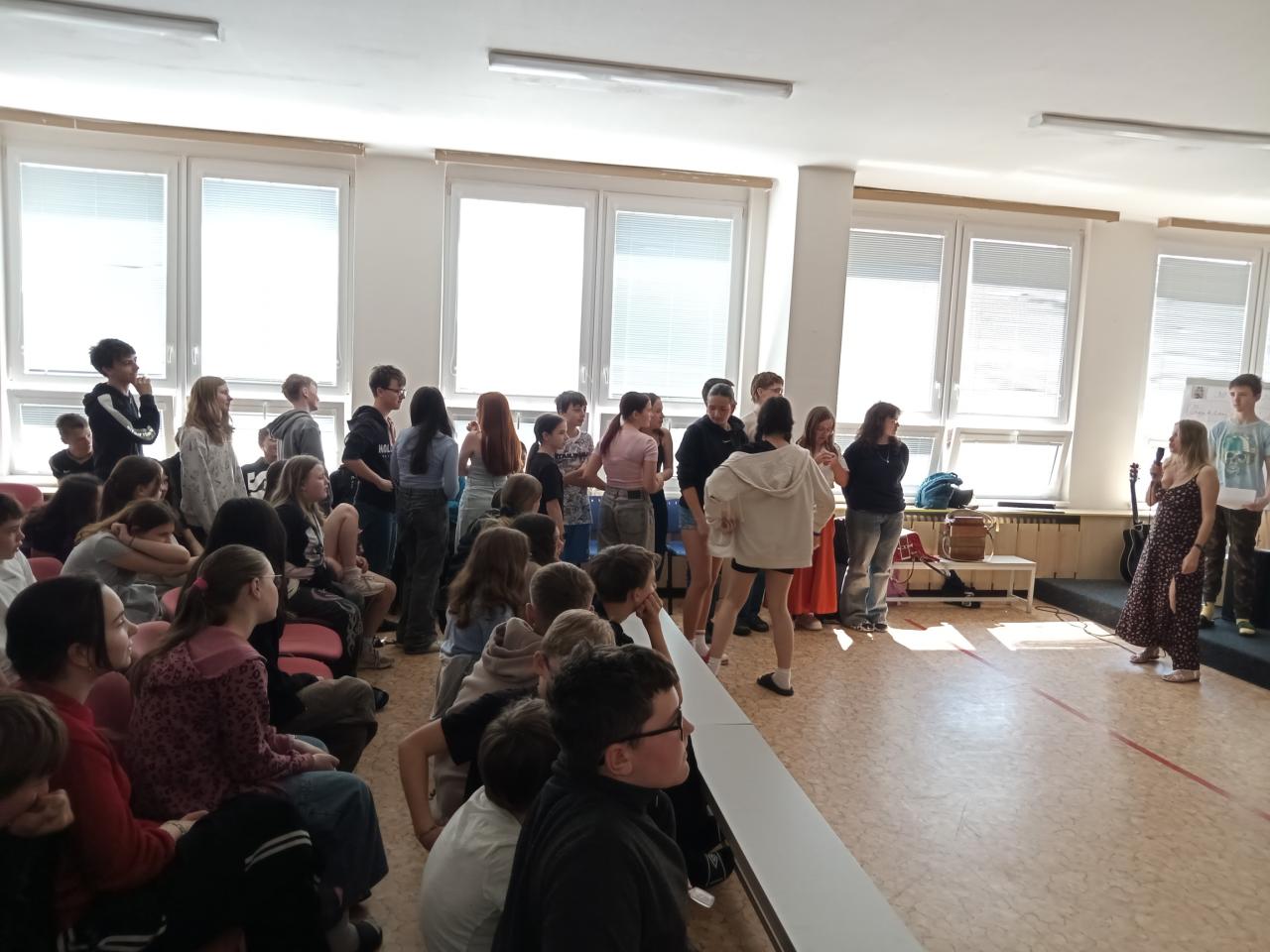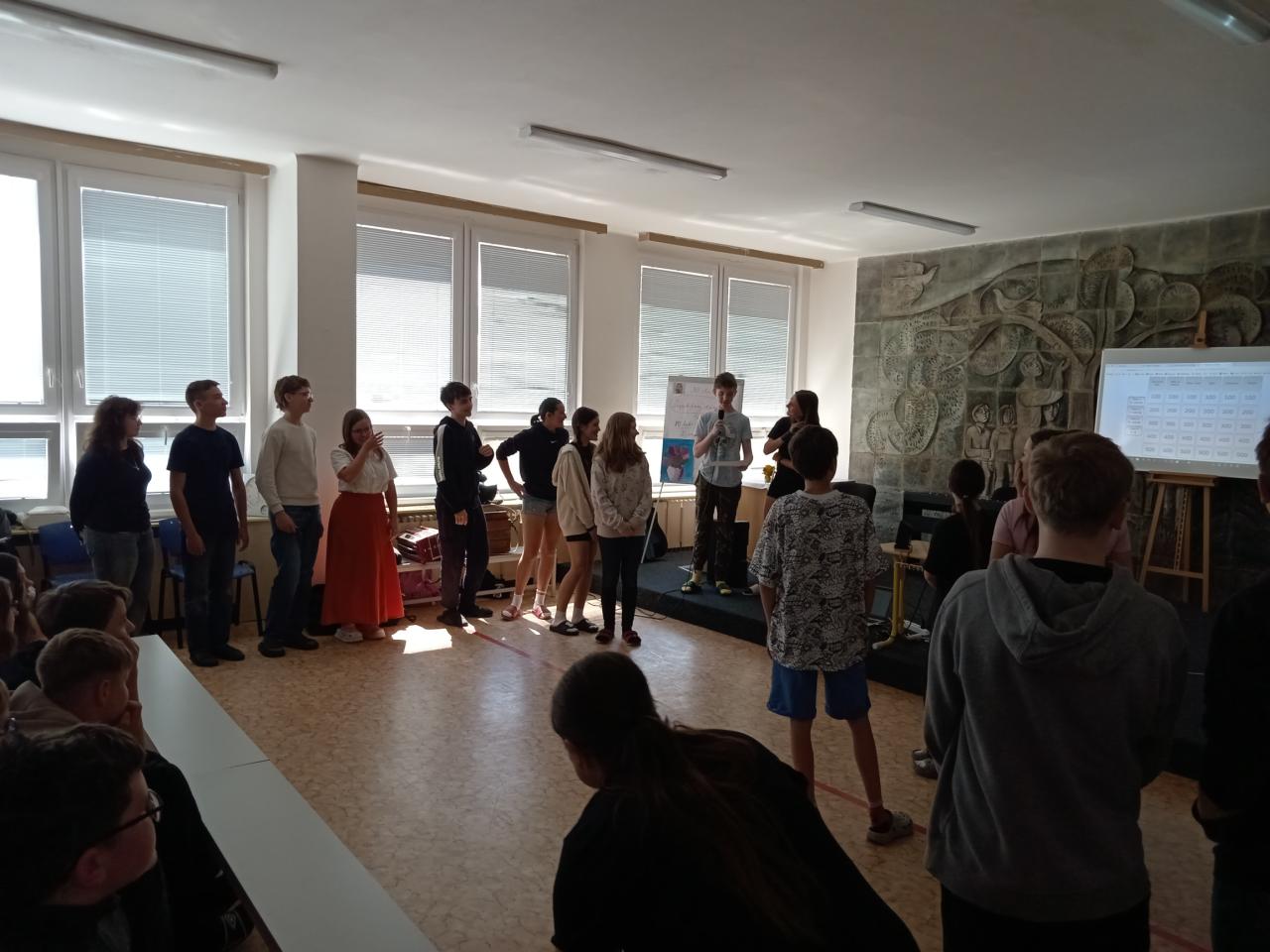 9. B zakončila vědomostním kvízem, ve kterém prověřila zástupce všech tříd ze znalostí o 2. světové válce. Otázky se opíraly o poznatky, které zazněly během celého projektového dne.