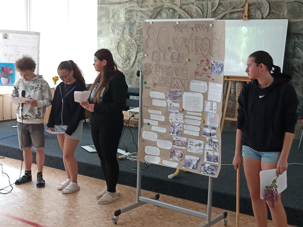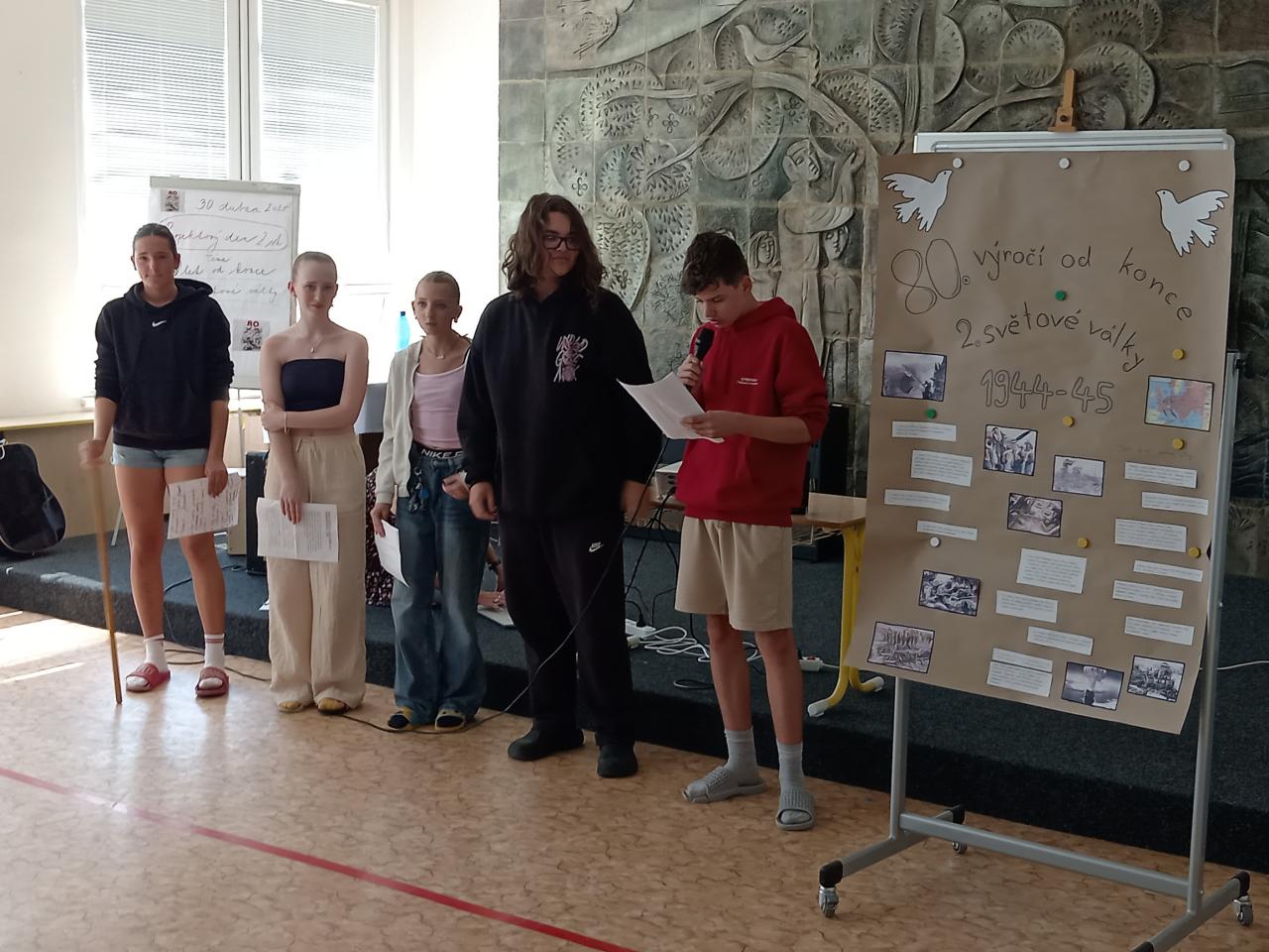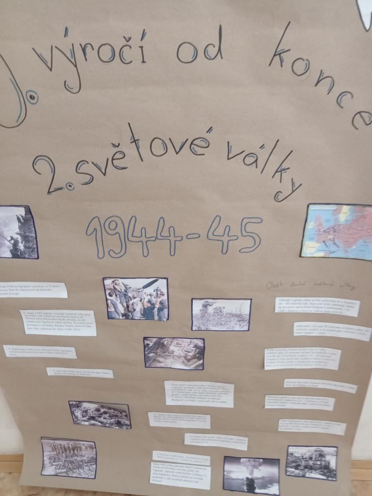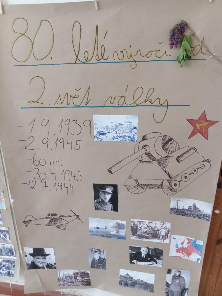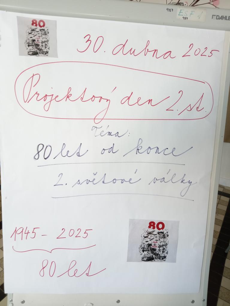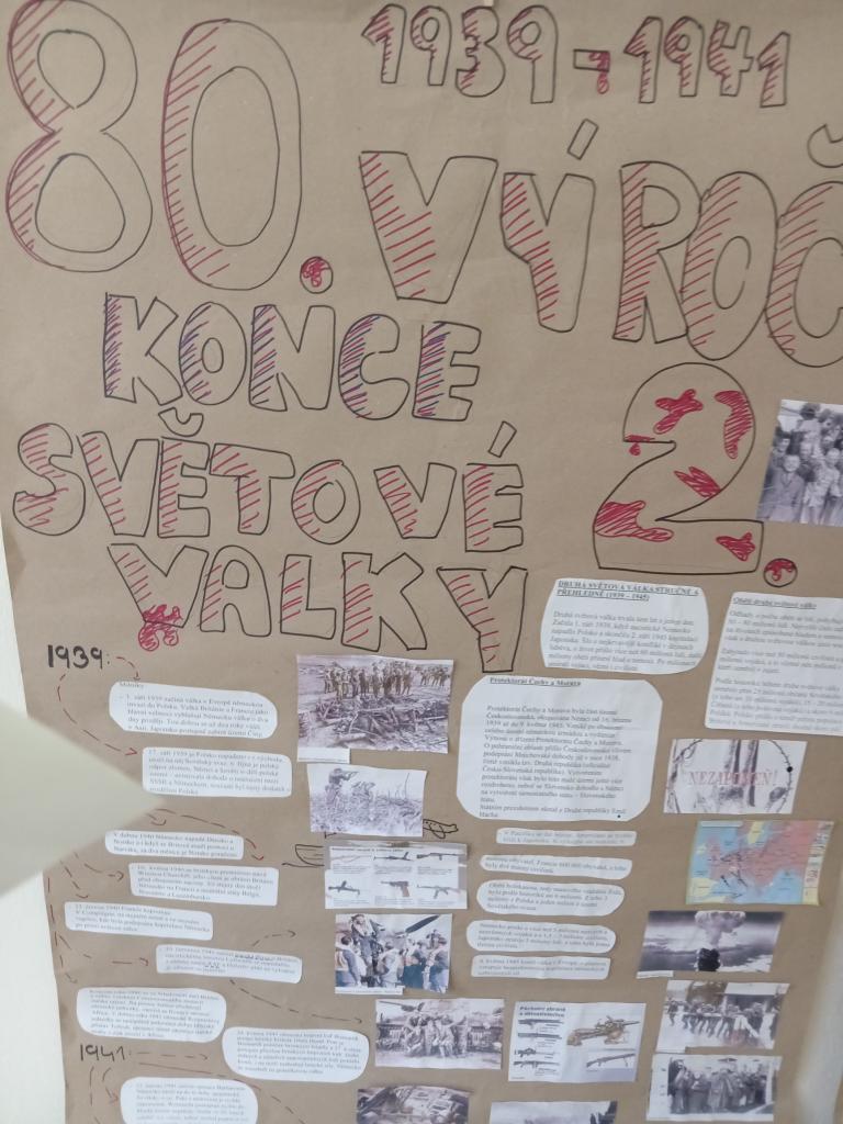 U příležitosti 80. výročí konce 2. světové války se konal projektový den, jehož cílem bylo nejen připomenout si jeden z největších konfliktů moderních dějin, ale především dát žákům příležitost prezentovat výsledky své práce, ukázat, jak dokážou spolupracovat, sdílet nápady a vystupovat před ostatními. Každá třída toto téma zpracovala vlastním originálním způsobem. Vznikla tak pestrá mozaika výstupů, které si následně mezi sebou jednotlivé třídy navzájem představily.