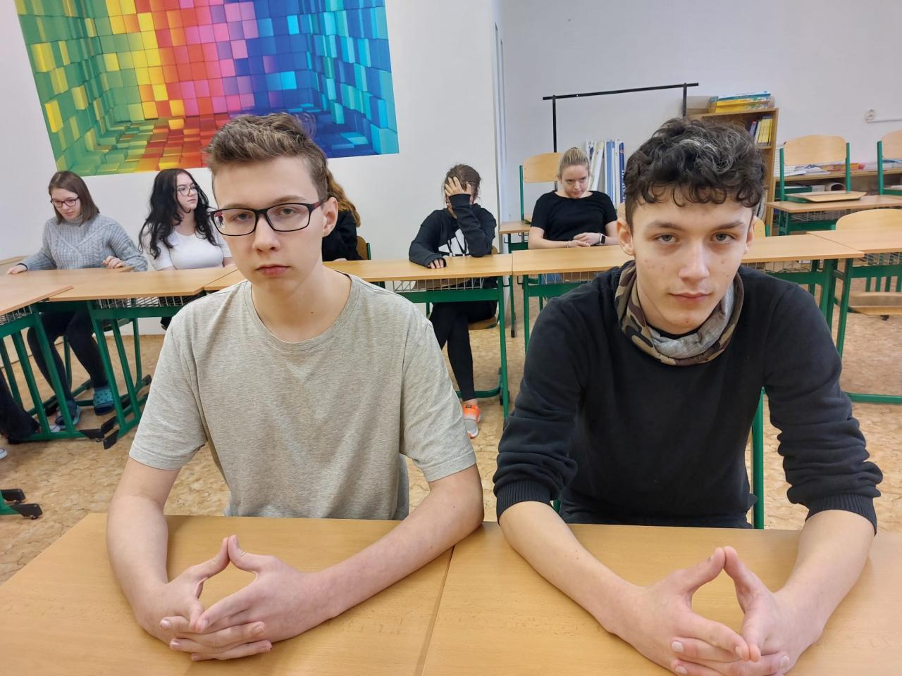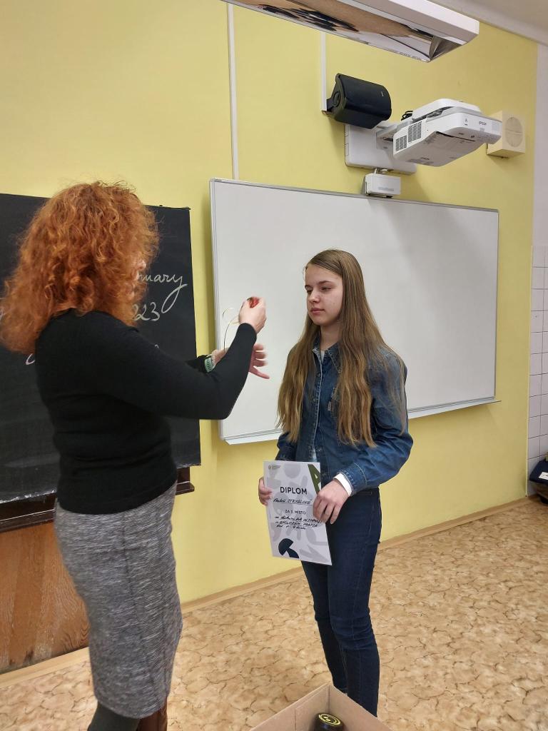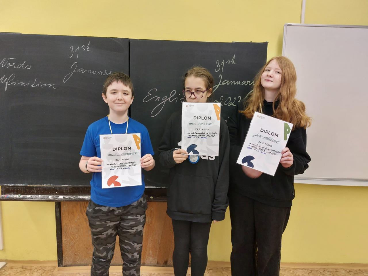 V kategorii 6. - 7. tříd zvítězil Martin Kocábek před stříbrnou Marii Honsovou a bronzovou Julií Voříškovou ze 7.B. V kategorii 8. - 9. tříd si nejlépe vedla Bára Abrahámová z 9.A. V těsném závěsu se stejným počtem bodů se na druhém místě umístila Martina Nováková z 9.B a o těsném výsledku musely rozhodnout body z konverzace. Na třetím místě se umístila Bára Stryalová z 9.A, a pokud se podíváte výše na úvod článku, zjistíte, že si Bára s Bárou přátelsky první a třetí příčku v obou jazycích prohodily.