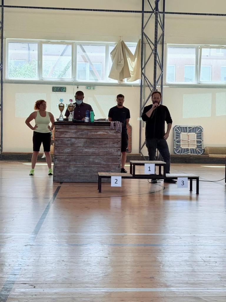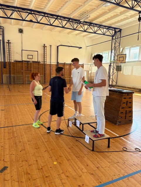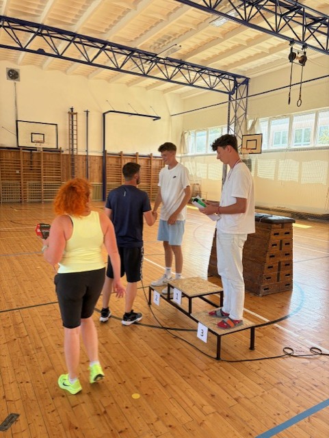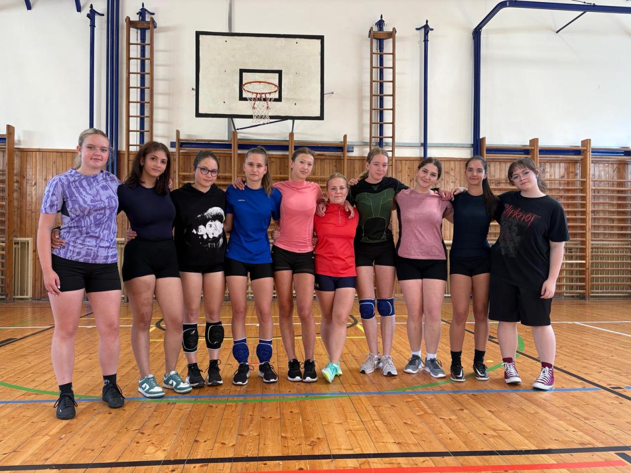 Po veselém skotačení na hudební produkci jsme vztyčili volejbalovou síť a začal, diváky oblíbený, turnaj odcházejících ročníků s pedagogy. Setkala se zde tři družstva – 9.A, 9.B a tým složený pouze z pedagogů. Boje byly napínavé, doprovázené ovacemi a povzbuzováním fanoušků z řad spolužáků i kolegů. Transparenty diváků podporovaly své oblíbence, ale hra probíhala v rámci fair play. Je krásné, když “učeň předčí mistra“, …a to se právě stalo, protože tým z “áčka“ porazil nejen své spolužáky z “béčka“, ale rovněž pedagogické hvězdy, a celý turnaj tak vyhrál.