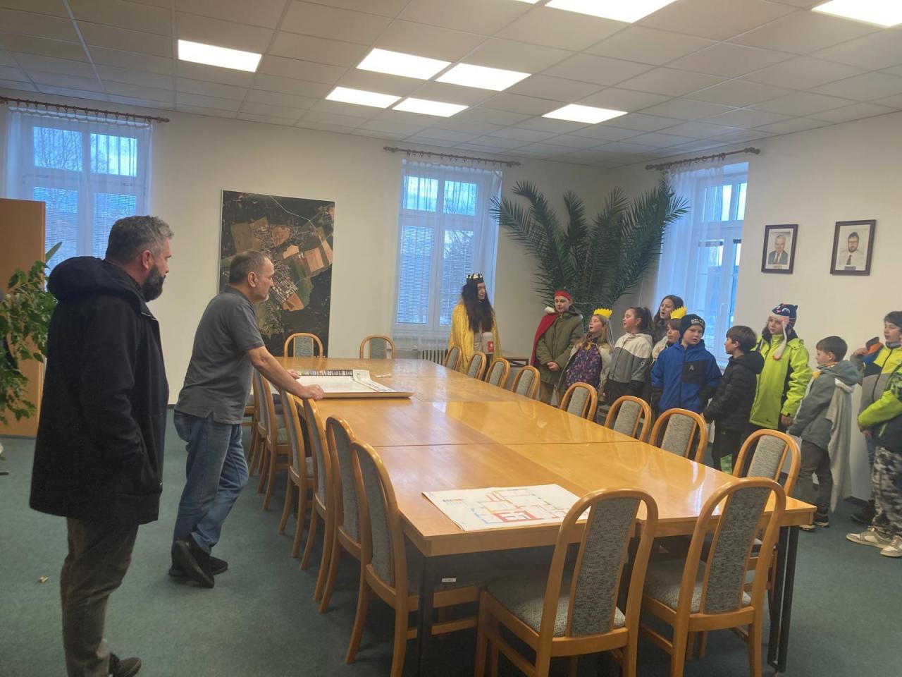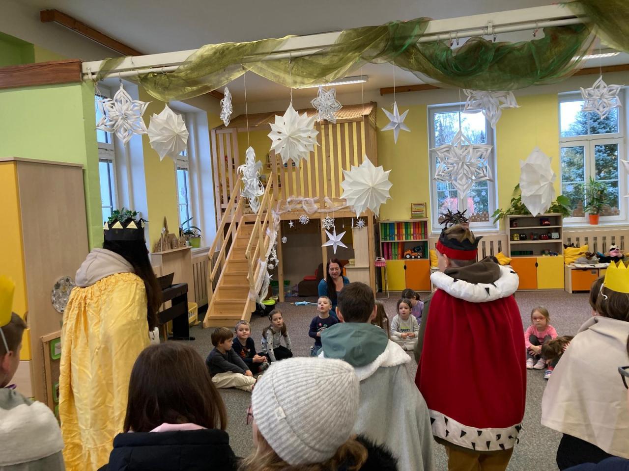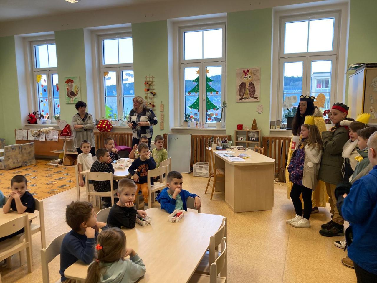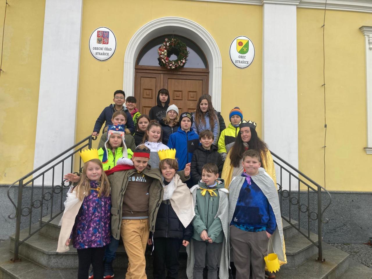 Také žáci 5. A se již tradičně oblékli do roztomilých rob králů a na hlavy si nasadili královské koruny. V doprovodu paní asistentky a třídní učitelky obešli strašickou mateřinku a obecní úřad. Ve školce vyprávěli dětem o tradicích a významu svátku Tří králů a společně pak zazpívali známé koledy. Zároveň sbírali do kasičky příspěvky od štědrých dárců. Ani kolemjdoucím nebyl průvod králů lhostejný a také velkoryse přispívali do sbírky.