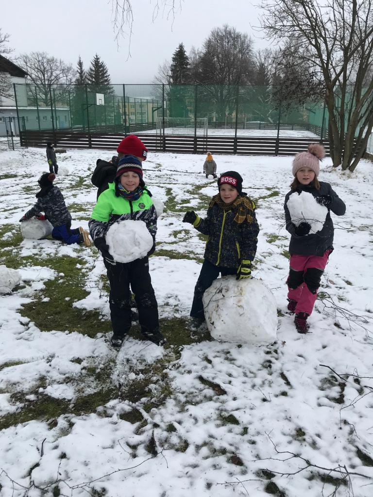 V úterý se nemohli dočkat naši druháčci poslední hodiny. Výuka tělesné výchovy neprobíhala v tělocvičně, ale na školní zahradě. Vyrazili jsme za malou zimní nadílkou, abychom si užili cvičení venku. Ve skupinách jsme stavěli sněhuláky, kteří nám vyzdobili naši zimní zahradu. Pyšnili jsme se povedenými sněhovými výtvory. S červenými tvářemi a břichy plnými hladu jsme zasedli k výbornému obědu. Pokud se paní zima umoudří, už se těšíme na další výpravu.