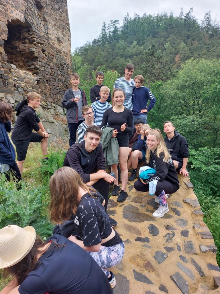 V úterý ráno jsme tedy odjeli na tábořiště Kobylka do Liblína, kde jsme se ubytovali v chatkách a vyšlápli si na nedalekou zříceninu hradu Libštejn, která se tyčí nad řekou v zelené záplavě stromů a keřů. Po vydatných deštích jsme si na klikaté úzké cestičce, vinoucí se v úbočím, připadali jako v Amazonském pralese. Večer si kluci a holky zahráli volejbal a užívali si třídní pospolitost a atmosféru, která je zase trochu jiná než ta ve třídě při výuce.