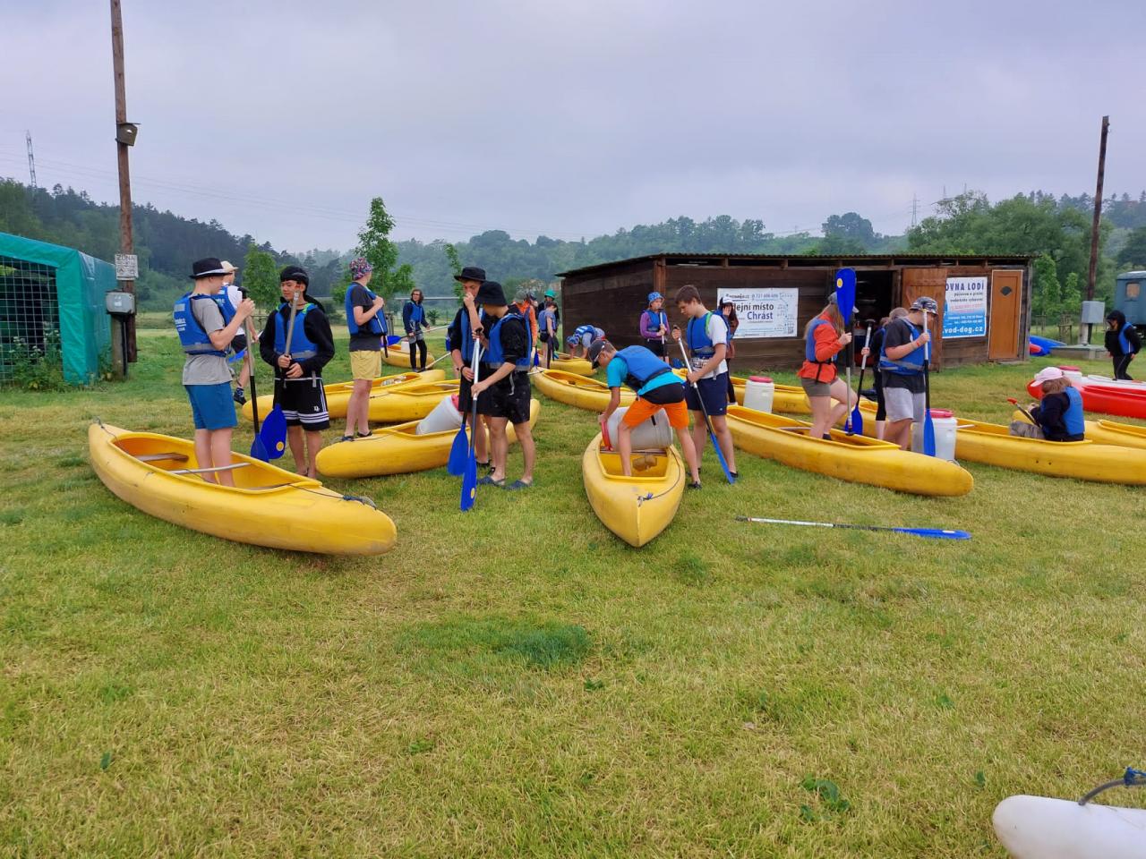 V letošním roce se na tuto oblíbenou akci vydalo 30 kluků a holek pod vedením zkušeného vodáka Martina Straky a jeho pomocníků Petra Šilhánka a Pavly Hrazdilové. Přípravy pondělního večera trochu narušila nepříjemná předpověď počasí, která slibovala vytrvalý déšť. Rozhodli jsme se naši výpravu nevzdat, ale pro klid žáků i jejich rodičů jsme trochu změnili podmínky přespávání, jelikož jsme zvyklí jezdit turisticky “na těžko“, a to je ve špatném počasí velmi nepohodlné.