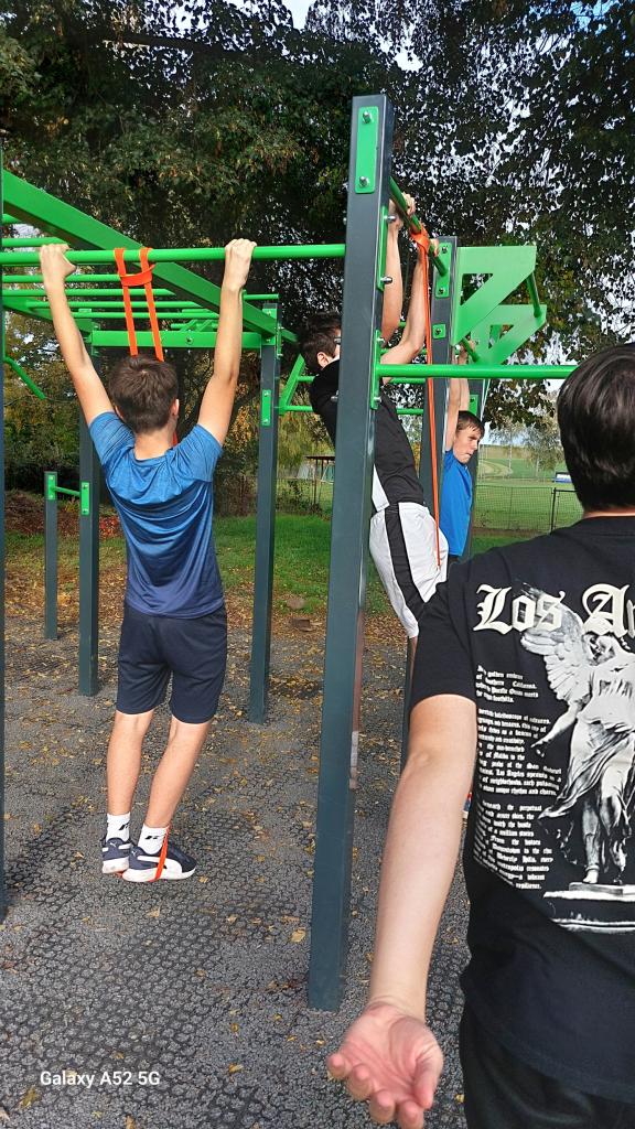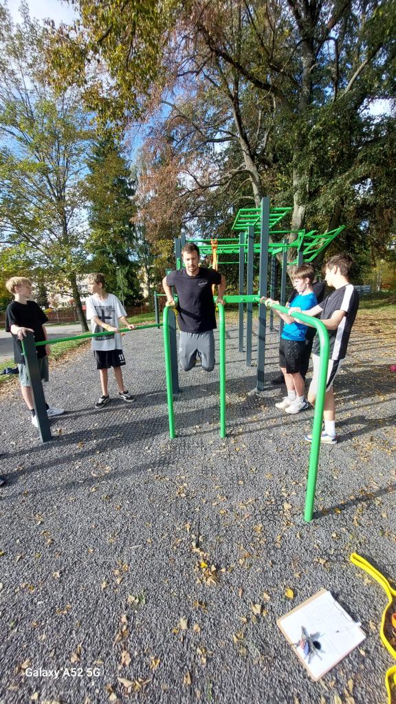 Pro cvičence byla připravena stanoviště, na kterých se v rámci kruhového tréninku střídali. Pan učitel nejprve všechny cviky pečlivě vysvětlil, ukázal a upozornil na důležitá pravidla, která vedou k tomu, aby byl cvik řádně proveden. Následně se sportovci pustili do cvičení, navzájem si pomáhali, kontrolovali se a jejich nadšení pro pohybové aktivity bylo umocněno příjemným podzimním odpoledním sluncem, které kluky pomáhalo ve shybech vytáhnout ještě výše.