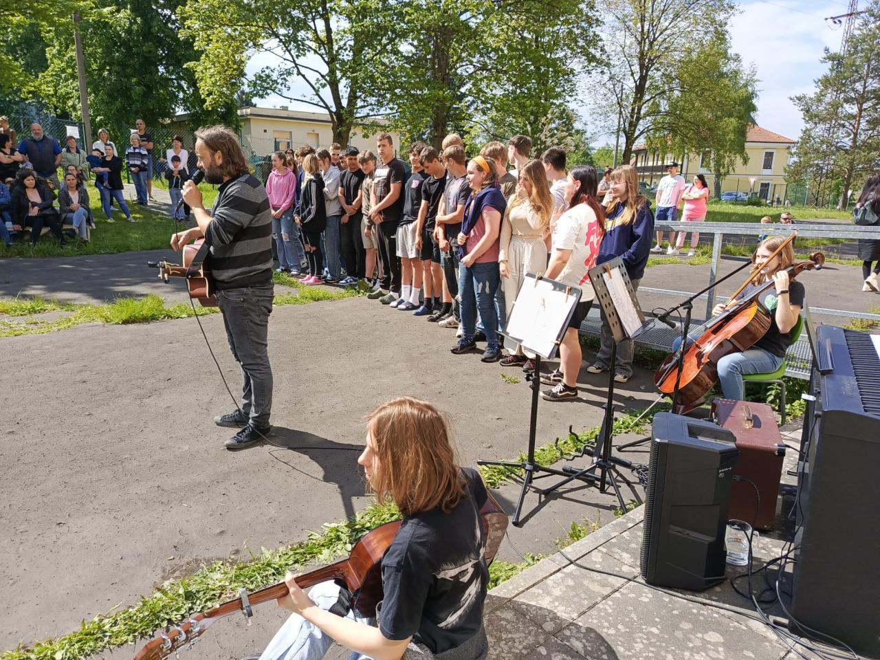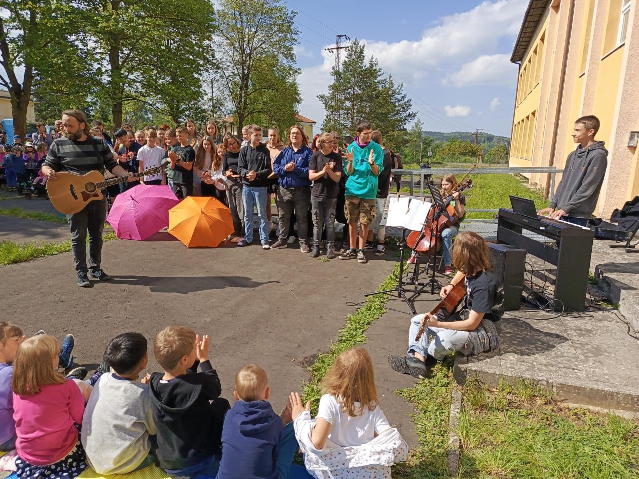Jednotlivé třídy se za hudebního doprovodu pana učitele Mgr. Petra Šilhánka a spolužáků s hudebního kroužku představily se svými písněmi.